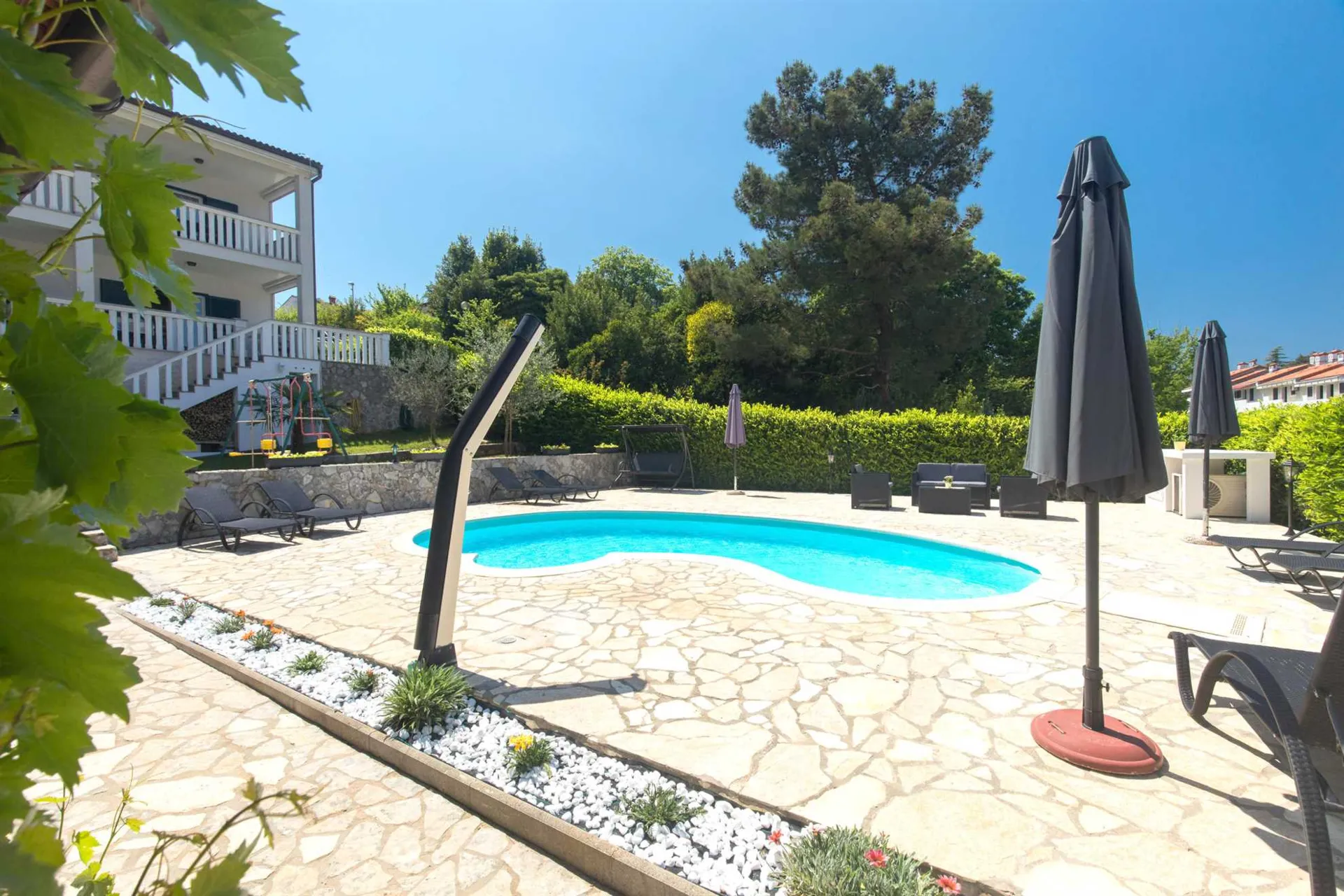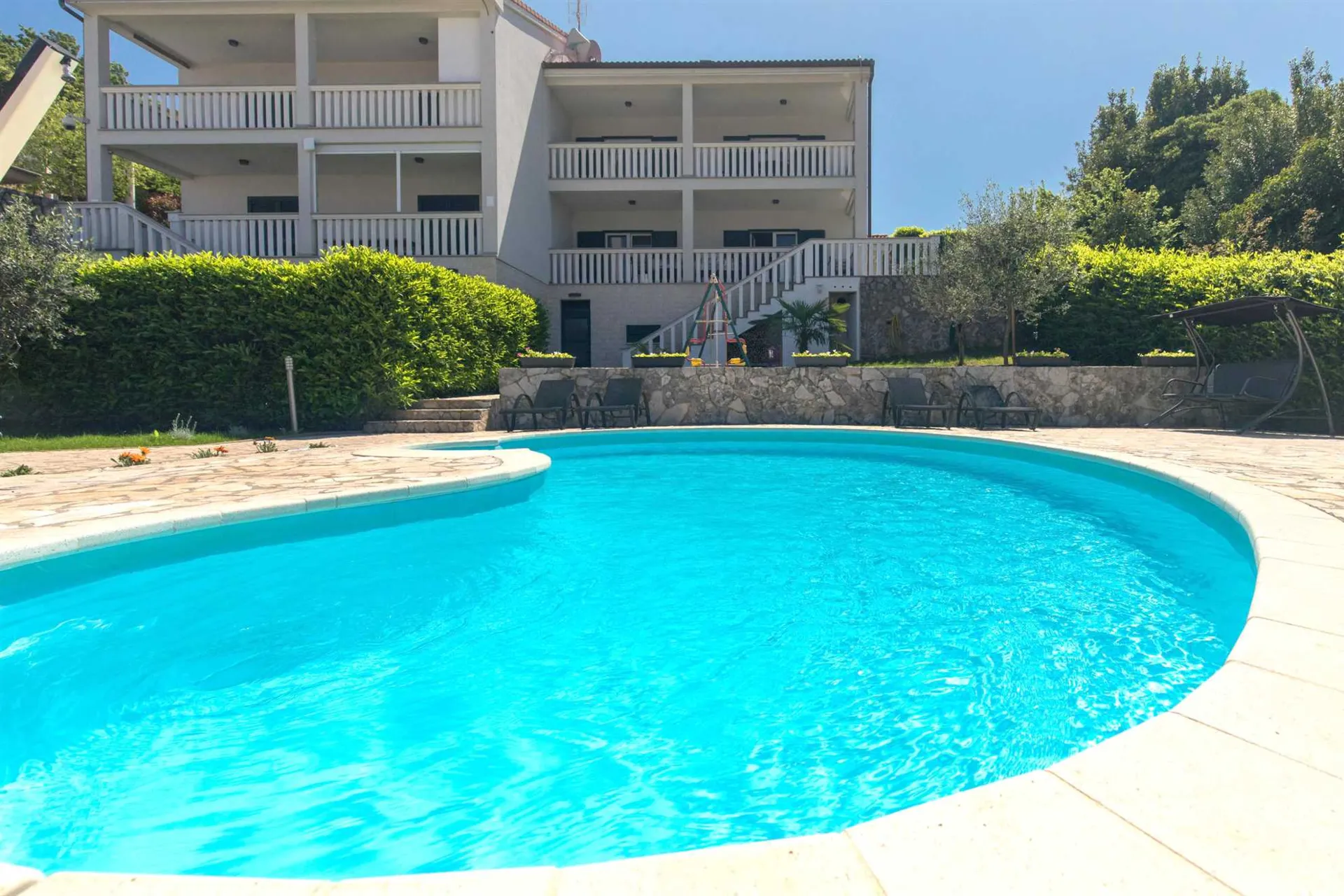 Basen na wyłączność ładne wnętrza dobrze wyposażone każdy apartament ma duży taras pralnie i łazienkę. Cicha okolica piękny ogród nieopodal sklepy kawiarnie restauracje port piekarnie. Miejsce na grill leżaki parasole czysty basen, osobna toaleta przy ogrodzie na duży plus, do małej plaży jakieś 400 m, wino od gospodyni