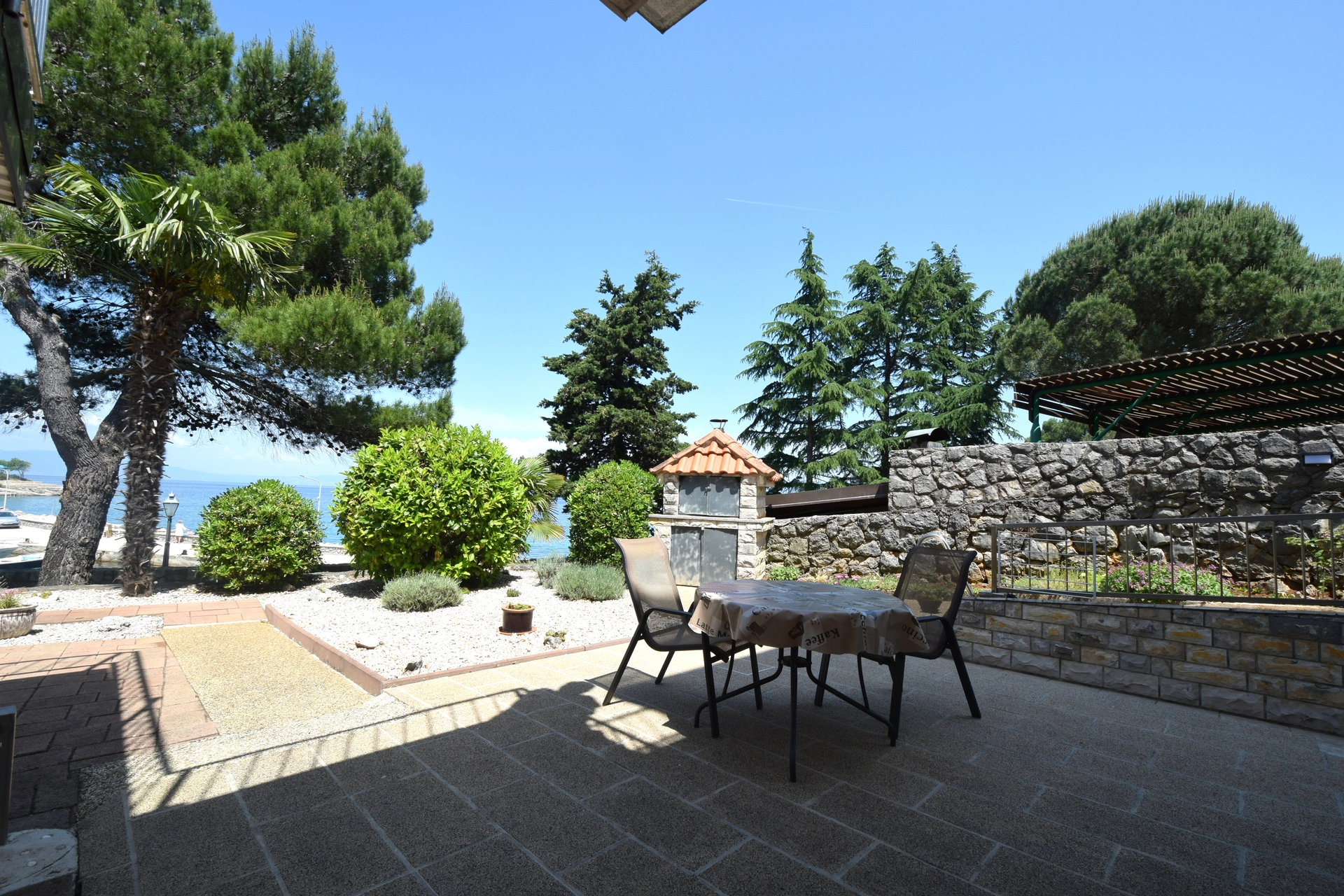 The apartment house Frane is situated approximately 3300 meters away from Malinska in the little tourist village of Vantačići. The house and the seashore are roughly 20 meters apart. The property has three apartments, each with a stunning view of the sea. With 60 square meters, the ground-level apartment Frane 3 can house five persons. It has two bedrooms, a dining area, a living room with a couch that can be used as an extra bed, a kitchen, a bathroom with a tub, and a private terrace with a view of the sea. You also have access to parking, WiFi, a coffee maker, and a satellite TV. Pets are not permitted.